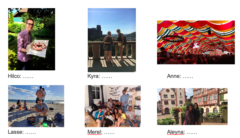 In Deutschland gibt es mehr als 12.000 Seen, ungefähr 25.000 Burgen und noch viele andere Sehenswürdigkeiten. Auch Hilco, Kyra, Anne, Lasse, Merel und Aleyna haben während ihrer Zeit in Deutschland verschiedene interessante Orte besucht und unterschiedliche Aktivitäten unternommen. Hier seht ihr 6 Zitate und 6 Fotos von unseren Studentenambassadeurs. Verbindet das Zitat mit dem Foto und schreibt den richtigen Buchstaben unter das Foto.