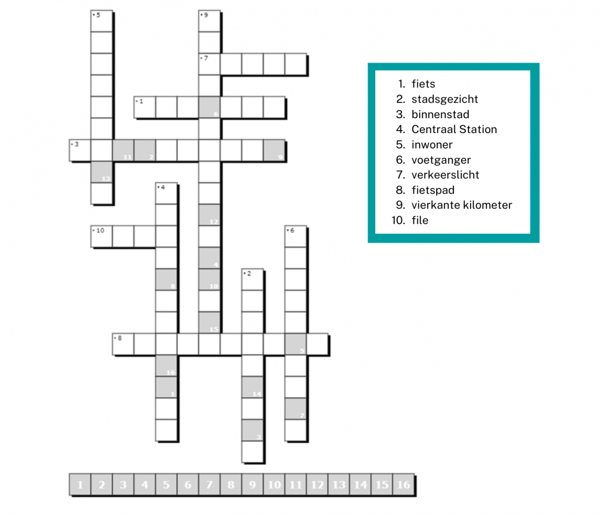 Macht gemeinsam das Kreuzworträtsel. Schreibt dazu die deutsche Übersetzung der niederländischen Wörter in die Spalten (= kolommen). Umlaute (ä,ü,ö) werden ae, ue, oe geschrieben.