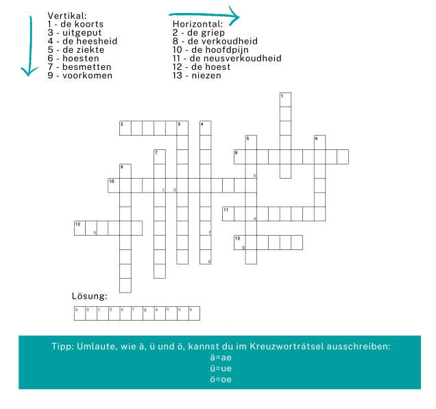 nten siehst du Wörter zum Thema Erkältung. Füge die deutschen Übersetzungen der Wörter ins Rätsel ein. Die Artikel „der“, „die“ oder „das“ werden weggelassen.
