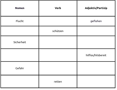 Schaue dir anschließend die Tabelle an und überlege dir, welche Wortarten hier fehlen. Es gibt nicht immer passende Wörter.