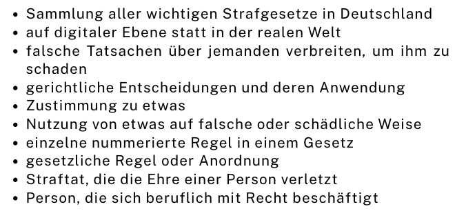 Im __________________ gibt es viele __________________, die genau festlegen, was erlaubt ist. Ein __________________ beschäftigt sich beruflich mit solchen Gesetzen. Bei Deepfakes ist oft unklar, ob eine Straftat vorliegt, da Gerichte noch keine eindeutige __________________ entwickelt haben. Wenn jemand ohne __________________ ein Bild oder Video veröffentlicht, kann das strafbar sein. In manchen Fällen kann es sich dann auch um ein __________________ handeln. Der __________________ von Videos und Bildern findet seit der KI-Revolution vermehrt auf __________________ Ebene statt.