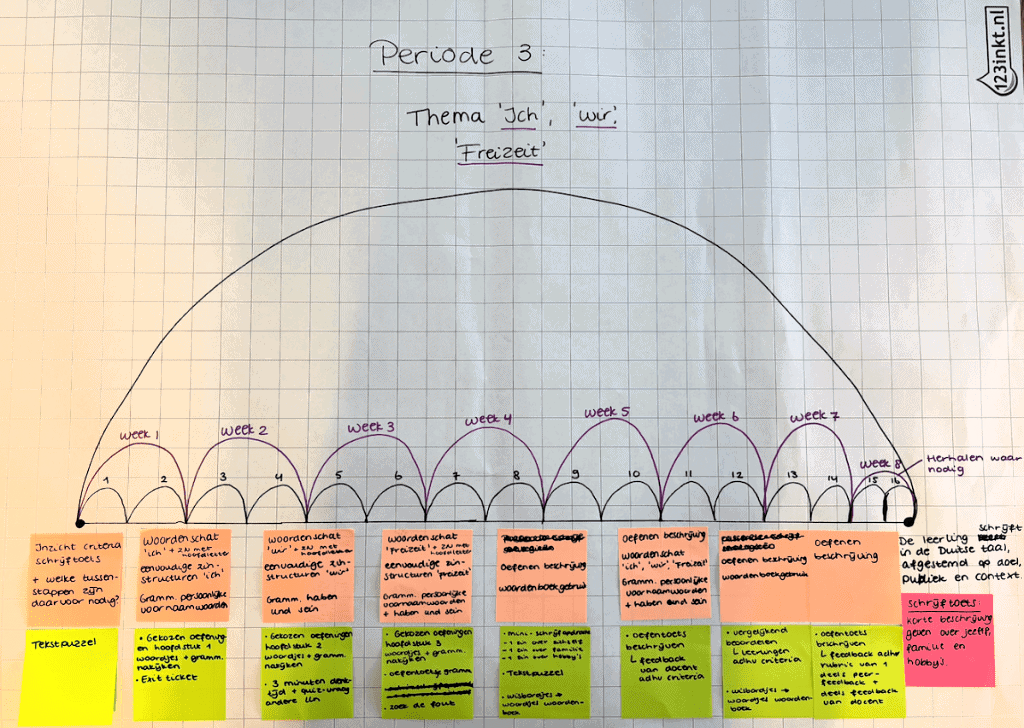 Nu je helder hebt wat leerlingen aan het einde moeten kennen en kunnen en hoe je dat zichtbaar gaat maken, kun je aan de slag met het concrete lesontwerp. Dit is hét moment om te bepalen hoe je lessen eruit gaan zien. Je kunt nu gaan nadenken over welke uitleg je gaat geven en wanneer, welke voorbeelden je gebruikt, welke oefeningen leerlingen gaan doen en hoe je materialen opbouwt.