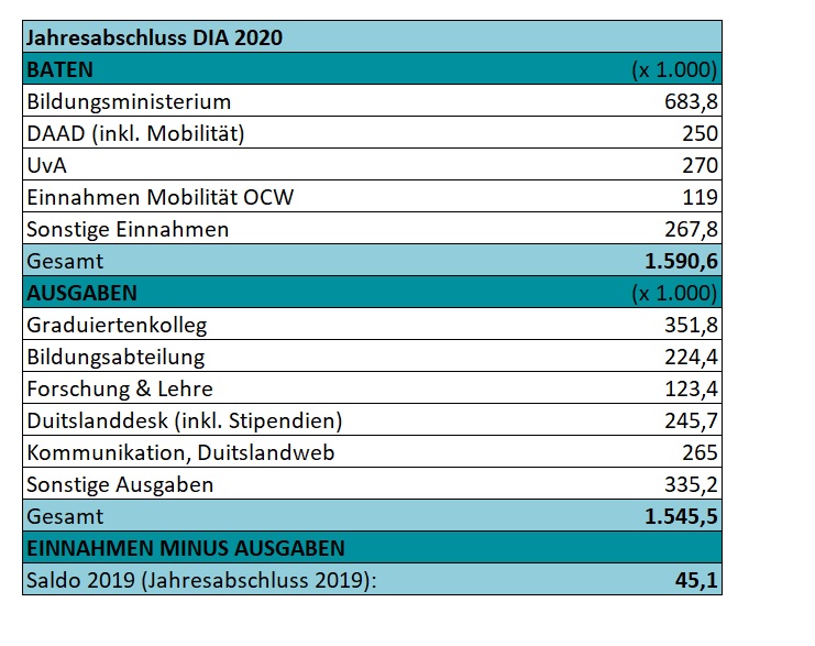 Im Jahr 2020 erhielt das DIA eine spezielle Subvention vom Bildungsministerium (OCW). Diese finanzielle Zulage wurde für die Umsetzung zweier Programme zur Verfügung gestellt: das DIA-Programm innerhalb der 'Deutschland-Agenda 2017-2021' und das DIA-Mobilitätsprogramm.