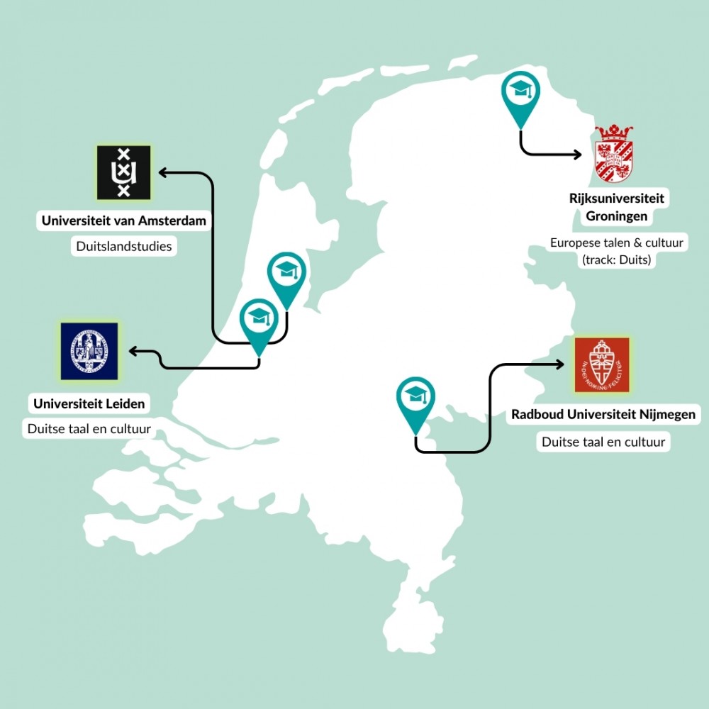 Waar kun je in Nederland Duits studeren? En waar kan je een opleiding doen tot leraar Duits? Zowel aan de universiteit als op het HBO worden bachelor- en masterstudies aangeboden. Hieronder vind je een overzicht inclusief links naar de website van de opleidingen.Daarnaast kun je veel informatie over deze studies vinden op de website studiekeuze123.nl inclusief een vergelijking van de verschillende studies en hier vind je een overzicht van de open dagen van de diverse opleiding Duitse taal en cultuur en de Lerarenopleidingen Duits.