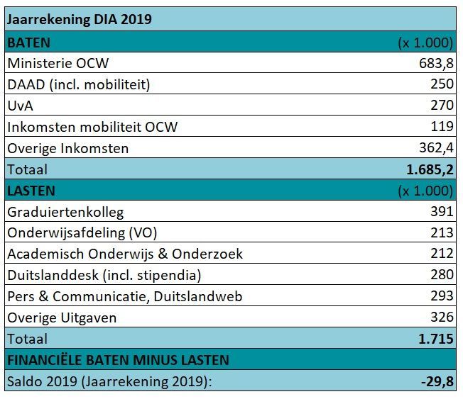 In 2019 ontving het DIA de bijdrage van het ministerie van OCW via een instellingssubsidie. Deze financiering is toegekend voor het realiseren van twee 'activiteiten': het DIA-programma dat valt onder de 'Duitsland-Agenda 2017-2021' en het 'DIA-Mobiliteitsprogramma'. Deze subsidie wordt verstrekt binnen de Kaderregeling subsidies OCW, SZW en VWS.