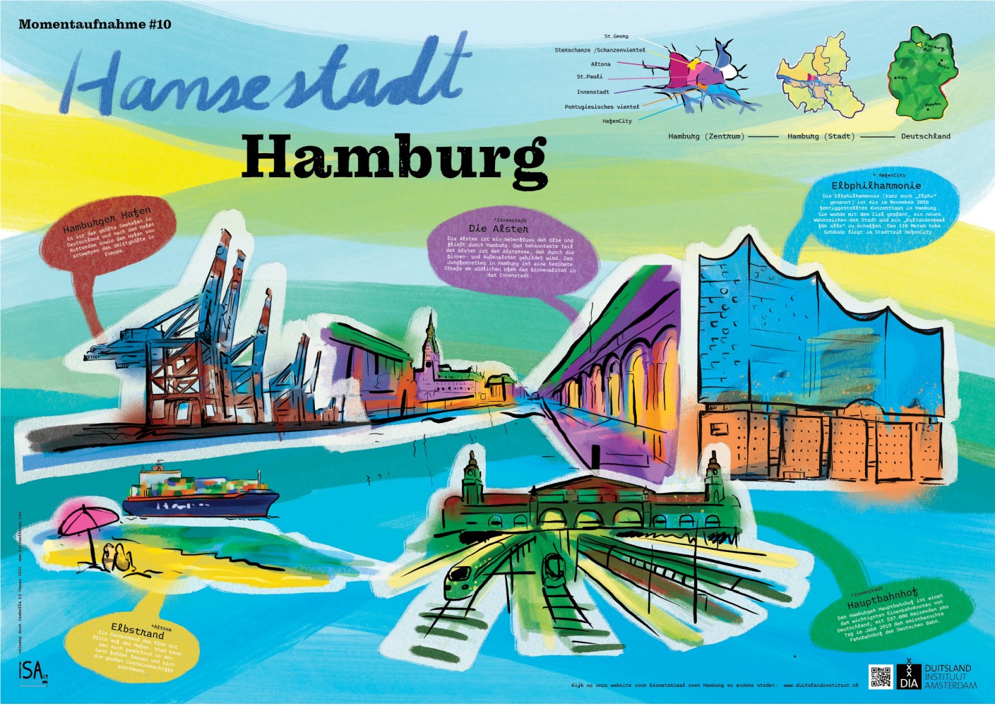 Op de onderwijsposter 2021 'Momentaufnahme 10' staat de Hansestadt Hamburg centraal met aandacht voor diverse bijzonderheden en bezienswaardigheden waaronder de Elbphilharmonie, de Alster, de grote haven en het Elbstrand.