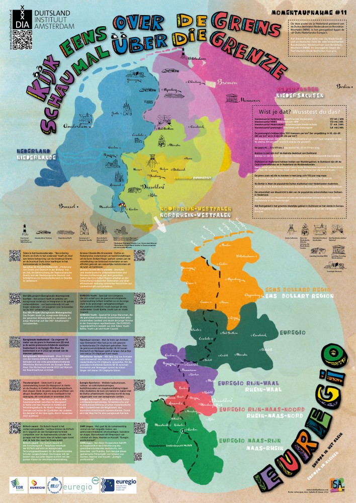 De Onderwijsposter Momentaufnahme #11 gaat over Nederland, Nordrhein-Westfalen en Niedersachsen. Bijzondere aandacht is er voor de grensstreek. Voor deze poster hebben we informatie ontvangen van de vijf Duits-Nederlandse euregio's. Deze staan dan ook prominent op de poster! Want een euregio, dat is Europa in het klein.