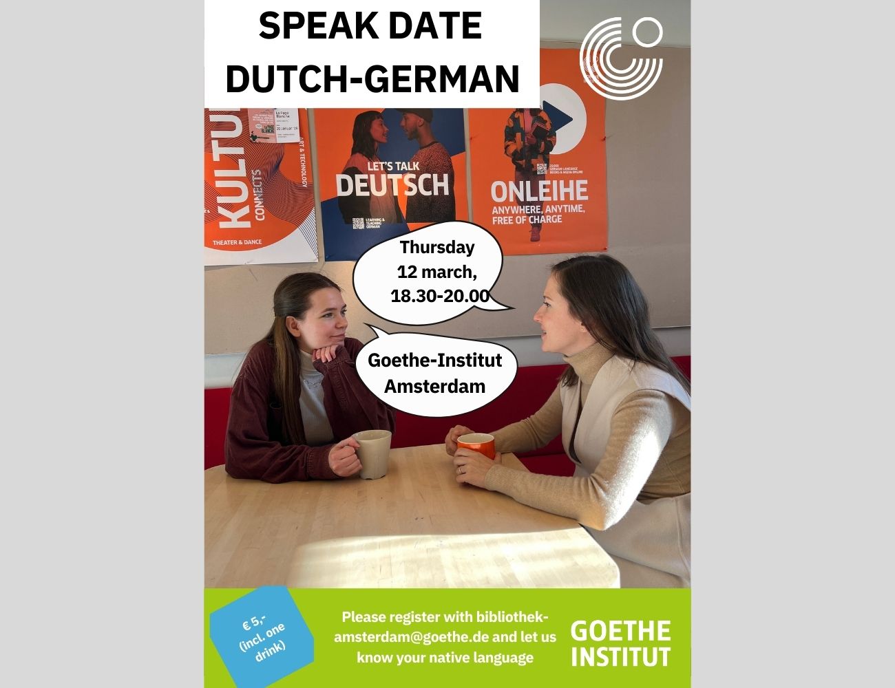 Het Goethe-Institut Amsterdam organiseert op donderdag 12 maart een speak date voor iedereen die Duits of Nederlands spreekt en de andere taal aan het leren is of heeft geleerd. Er zullen verschillende activiteiten zijn waarmee de taal in tandem kan worden geoefend en eventueel langere taalpartnerschappen kunnen worden aangegaan. Na afloop is er gelegenheid voor informele uitwisseling in de kantine, bibliotheek en tuin van het instituut.