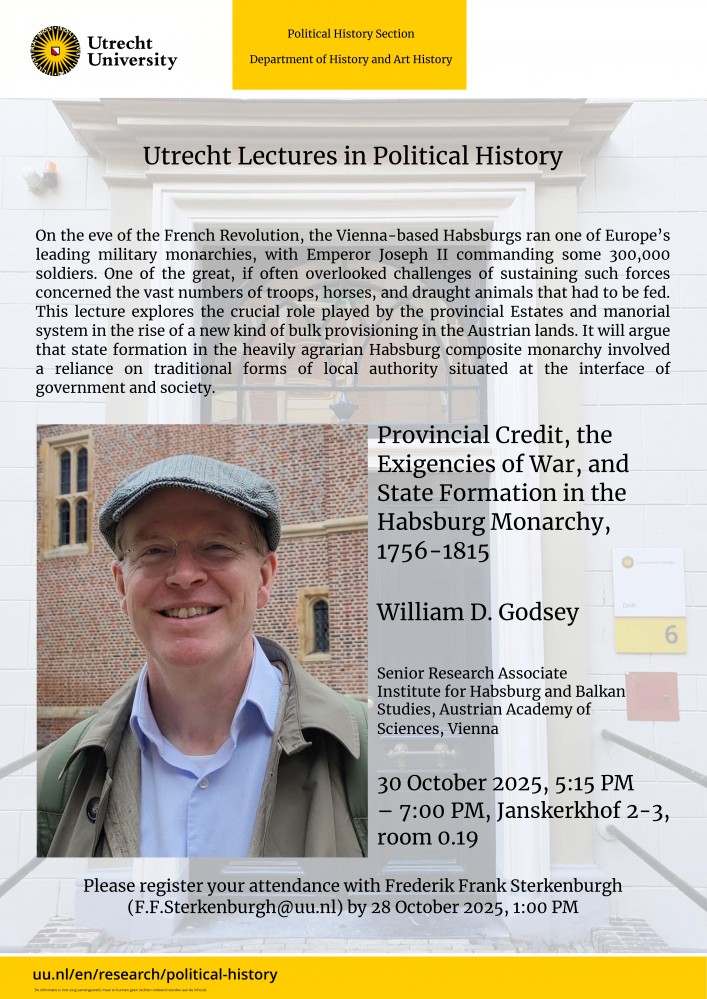 Aan de vooravond van de Franse Revolutie regeerden de Habsburgers vanuit Wenen over een van de belangrijkste militaire monarchieën van Europa, met keizer Jozef II aan het hoofd van zo'n 300.000 soldaten. Een van de grote, maar vaak over het hoofd geziene uitdagingen bij het in stand houden van een dergelijk leger was het enorme aantal soldaten, paarden en trekdieren dat gevoed moest worden. Deze door William D.Godsey gegeven lezing op 30 oktober a.s. onderzoekt de cruciale rol die de provinciale standen en het landgoedstelsel speelden bij de opkomst van een nieuw soort bulkbevoorrading in de Oostenrijkse gebieden.