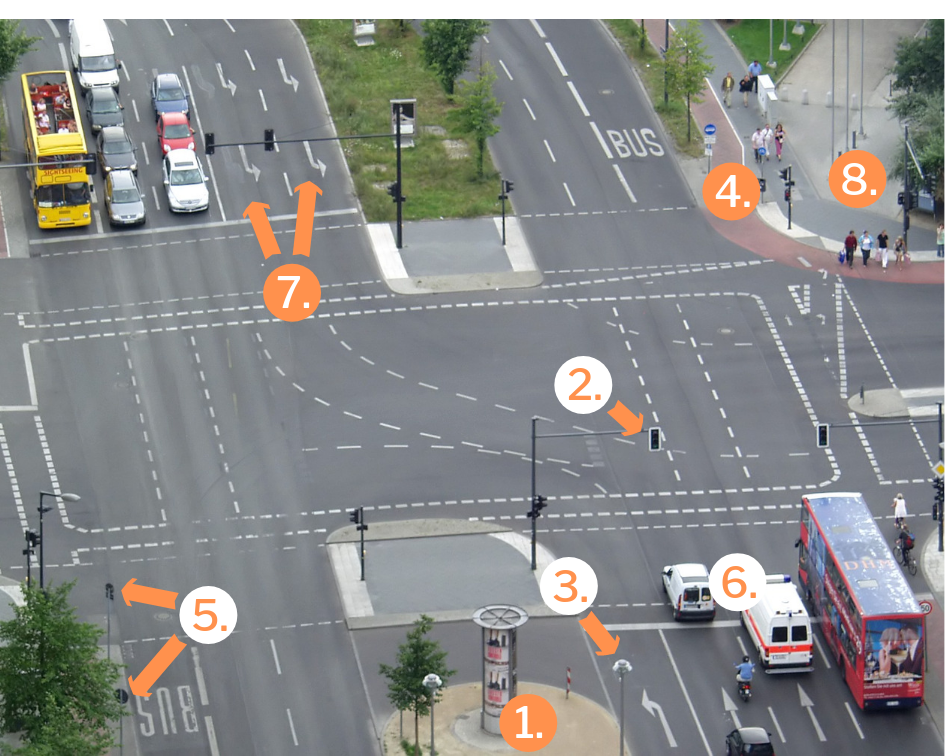 Auf dem Bild seht ihr eine Kreuzung in Berlin. Viele Objekte sind den niederländischen Objekten ähnlich, haben aber nicht denselben Namen. Übt euren deutschen Verkehrswortschatz!