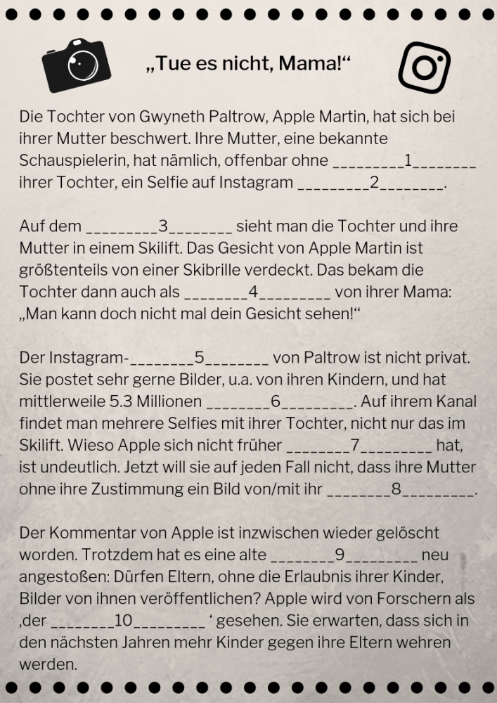 - Haben eure Eltern schon mal Bilder von euch gepostet, ohne euch um Erlaubnis zu fragen? Was für ein Bild war das? Was haltet ihr davon? Was habt ihr gemacht? Diskutiert mit eurem Nachbarn.