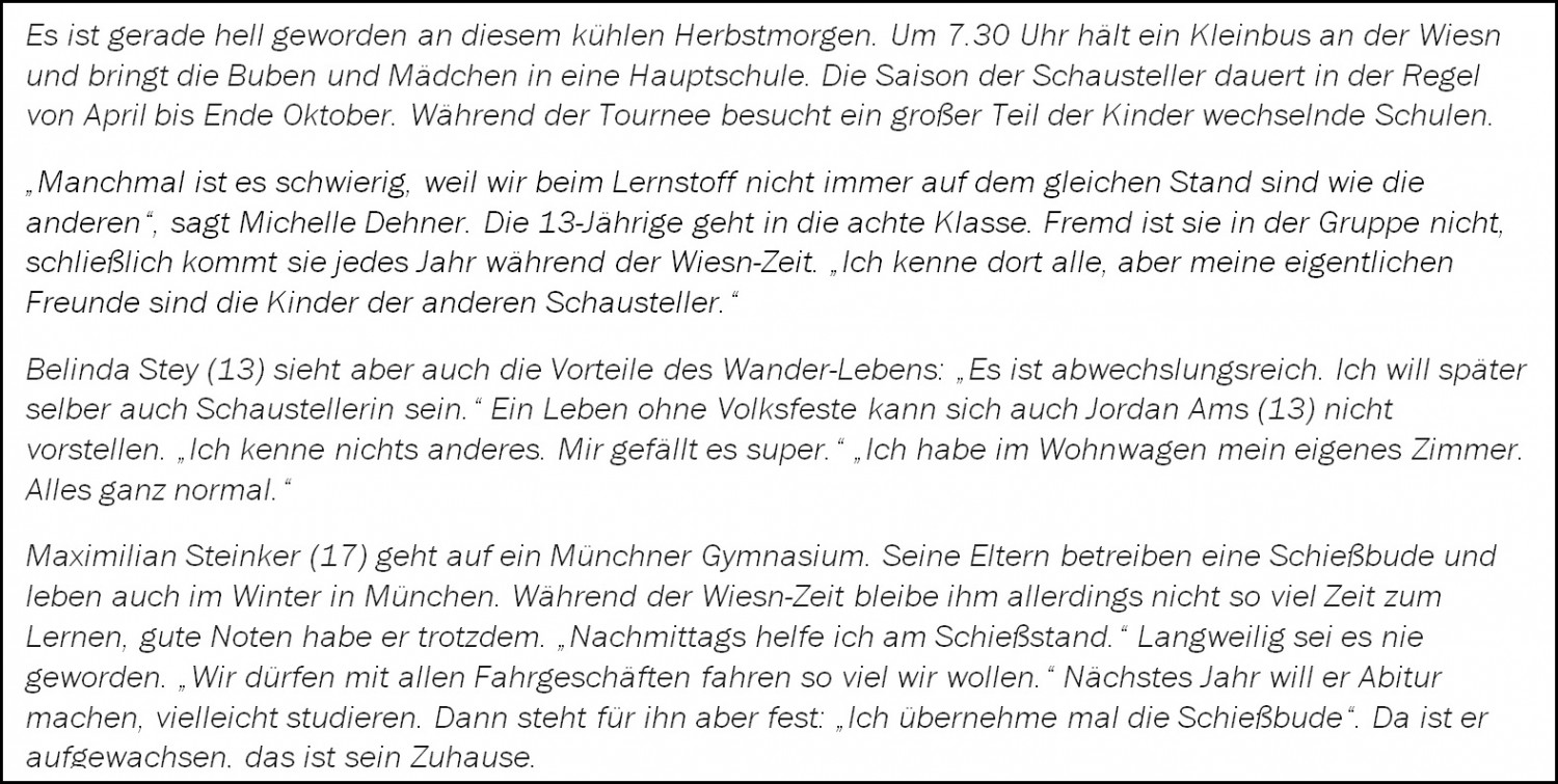Im folgenden Text erfahrt ihr, wie das Leben von Jugendlichen aussieht, deren Eltern Schausteller sind.
