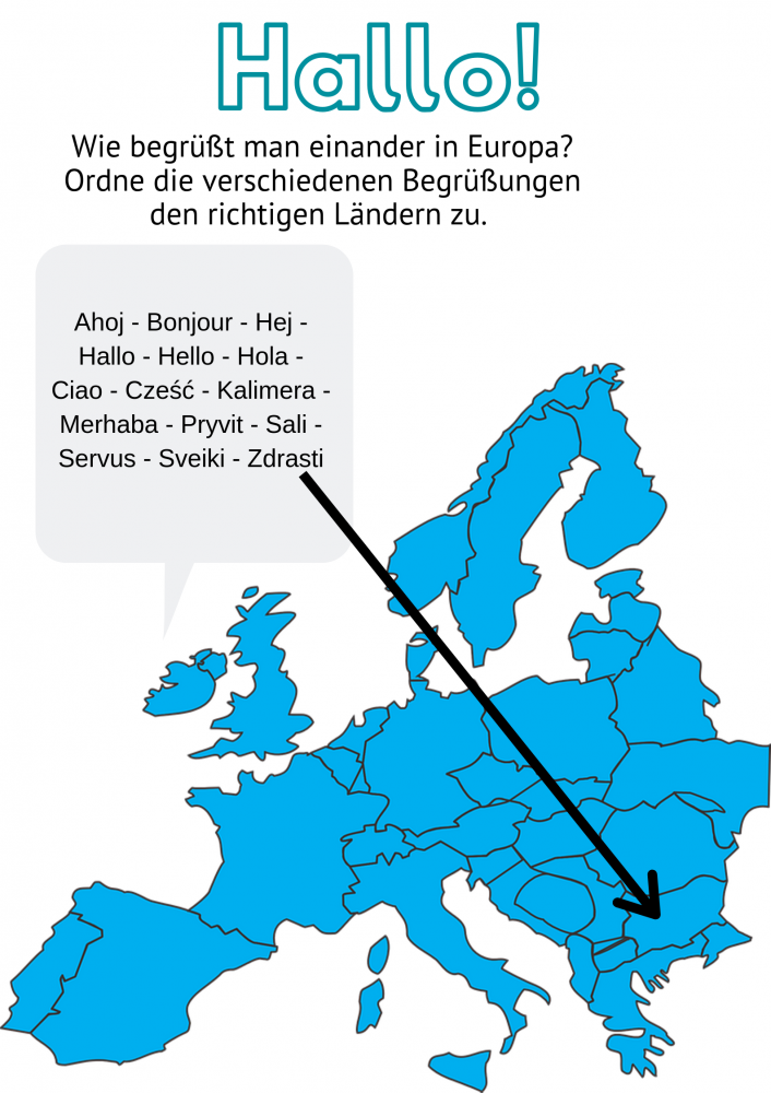 - Schau dir das Bild an und ordne die Begrüßungen den richtigen Ländern zu.