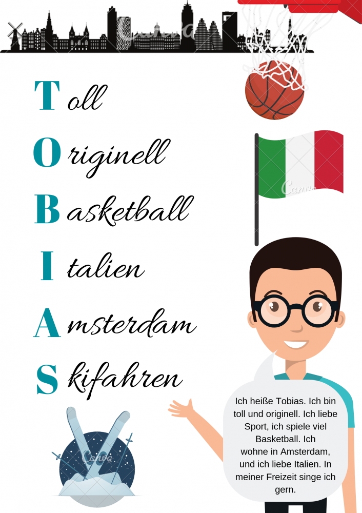 Und jetzt bist du selbst dran! Schreibe Wörter über dich selbst auf, die mit den Buchstaben deines Namens beginnen. Schreibe danach mit diesen Wörtern einen Text über dich selbst. Du darfst dein Blatt auch verzieren. Wenn du willst, kannst du ein Wörterbuch Deutsch-Niederländisch benutzen.
