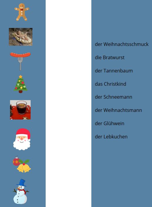 Welche Wörter zum Thema Weihnachten kennst du schon? Verbinde die Wörter mit den passenden Bildern.