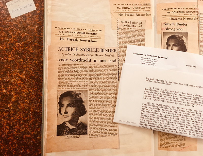 De culturele nasleep van de Tweede Wereldoorlog zie je ook terug in artikelen over het GNLD in lokale kranten. Zo trad in 1954 de Oostenrijkse actrice Sybille Binder op uitnodiging van het Genootschap in Nederland op. Het Haagsch Dagblad en het Parool schreven: “Van Sybille Binder is bekend dat zij haar leven lang even hartstochtelijk ‘ja’ zei tegen het toneel als later ‘neen’ tegen het Nazidom.”