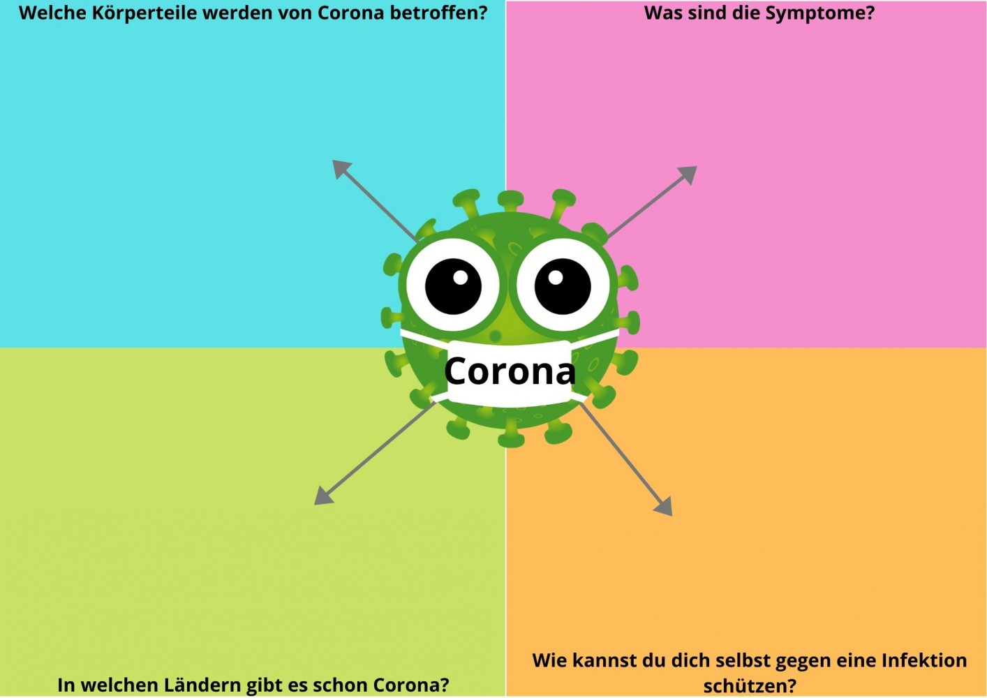 - Notiere unten, welche Wörter, die etwas mit dem Virus zu tun haben, du schon kennst. Es gibt vier verschiedene Kategorien.