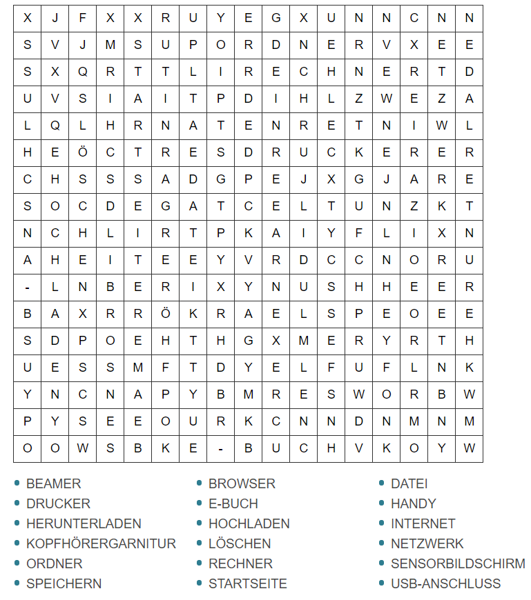 - Im Worträtsel stehen verschiedene Wörter, die mit Digitalisierung zu tun haben. Suche die Wörter!