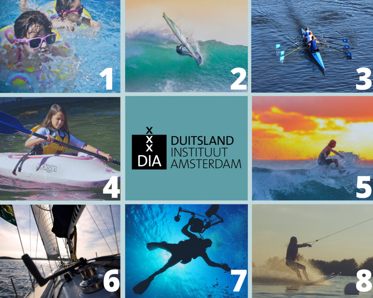 - Welches Wort passt zu welchem Bild? Verbindet die Wörter mit den richtigen Nummern. Wählt aus: surfen – rudern – tauchen – Wasserski laufen – schwimmen – segeln – Kajak fahren – windsurfen
