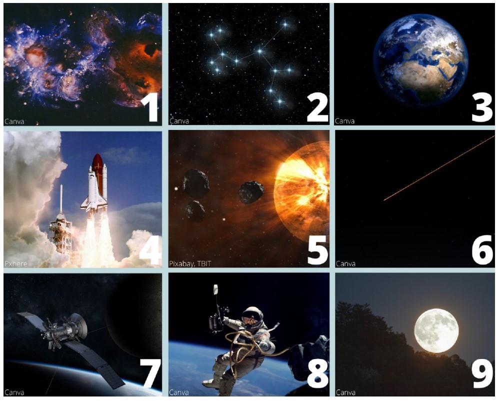 der Asteroid, die Milchstraße, der Astronaut, der Planet, die Sternschnuppe, der Satellit, der Mond, das Sternbild, die Rakete