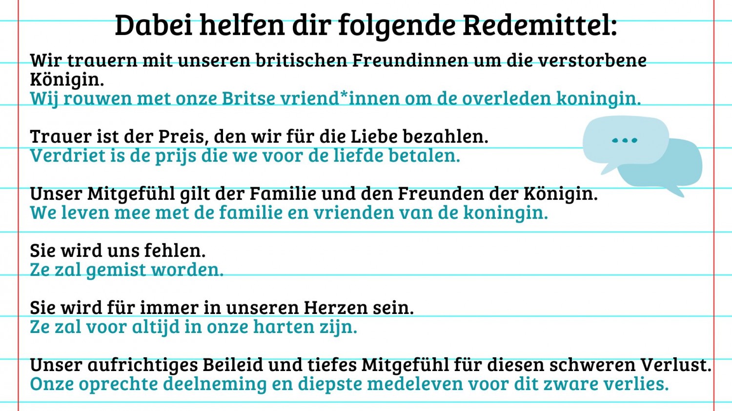 Viele Prominente und Politiker*innen haben in den sozialen Medien ihre Anteilnahme ausgesprochen (= deelname uitgesproken). Olaf Scholz, der deutsche Bundeskanzler, hielt eine emotionale Rede. Er beschreibt die Königin als ,,eine Jahrhundertfigur‘‘, deren ,,Pflichtgefühl ebenso unerschütterlich (= onverstoorbaar) wie legendär‘‘ war. Das Auswärtige Amt (= het ministerie van buitenlandse zaken) dankt der Königin auf Instagram dafür, dass sie Deutschland nach dem Zweiten Weltkrieg ,,die Hand zur Versöhnung gereicht hat‘‘. Sie hat eine große Rolle beim Aufbau der Beziehungen zwischen der Bundesrepublik Deutschland und dem Vereinigten Königreich gespielt.