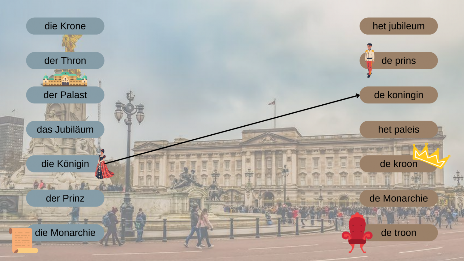 Welche Wörter zum Thema ,König / Königin’ kennst du schon? Verbinde die deutschen Wörter mit den richtigen Übersetzungen.