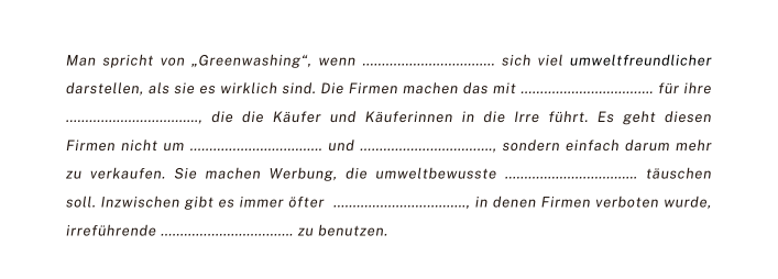 Inzwischen gibt es immer mehr Produkte mit besonderen Siegeln (=zegels), wie "klimaneutraler" Joghurt oder "umweltneutrales" Shampoo. Das klingt natürlich gut für das Klima. Aber sind solche Produkte wirklich besser für unsere Erde? Leider nicht immer. Manche Firmen machen falsche Versprechungen (=beloftes), um mehr von ihren Sachen zu verkaufen. Es handelt sich um einen Marketing-Trick: Greenwashing