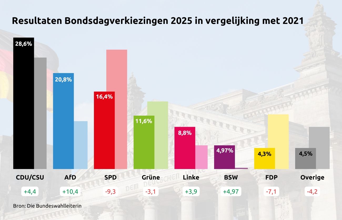 Het allerbeste resultaat werd overigens niet geboekt door een partij, maar door de verkiezingen zelf. Met 82,5 procent is dit de hoogste opkomst bij een Bondsdagverkiezing sinds de eenwording van Duitsland. Dat betekent dat er veel nieuwe stemmen te verdelen waren en daar wist vooral de AfD van te profiteren. Ruim 1,8 miljoen van hun kiezers bleven in 2021 nog thuis. Ook CDU/CSU wist veel niet-kiezers te mobiliseren, 900.000 Duitsers die in 2021 thuisbleven, stemden nu op de partij van Friedrich Merz. En ook Die Linke pikte er een graantje van mee, de partij trok zo’n 290.000 thuisblijvers toch naar het stemhokje.