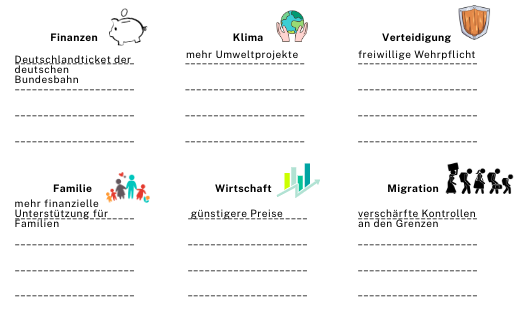 Stelle dir vor, du würdest in Deutschland leben. Wähle 2 Aspekte, die dir wichtig sind. Notiere 3 Beispiele pro Aspekt, die deiner Meinung nach verbessert werden sollen. Orientiere dich an dem vorgegebenen Beispiel.