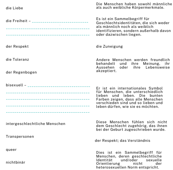 - Überlege dir mindestens 1 Tipp, um Menschen mit einer anderen geschlechtlichen Identität oder sexuellen Orientierung zu unterstützen.