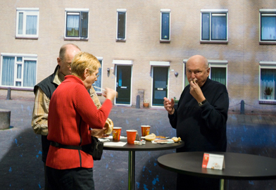 Ook Willem II (van de sigaren) en Douwe Egberts (koffie) zijn van de partij, allemaal netjes gerangschikt om een paviljoen van tulpen, een molen en ander fleurigs uit Holland. Ook wat aankleding betreft doet de Nederlandse bijdrage vooral traditioneel aan. Maar een kijkje om de hoek, en de bezoeker kan zijn zojuist gekochte hapjes heel verrassend oppeuzelen aan een tafeltje op de stoep van een keurige Hollandse woonwijk, tegen een decor van strakke rijtjeshuizen.