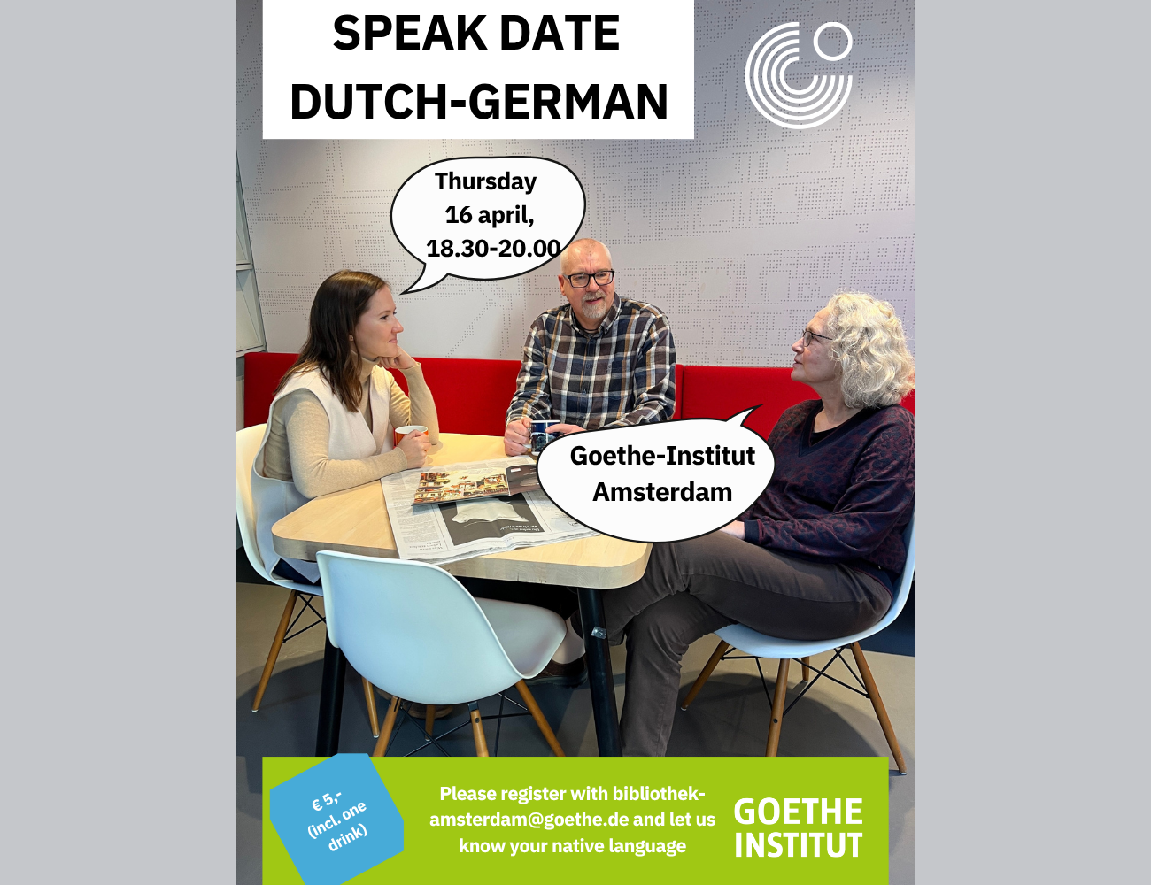 Het Goethe-Institut Amsterdam organiseert op donderdag 16 april een speak date voor iedereen die Duits of Nederlands spreekt en de andere taal aan het leren is of heeft geleerd. Er zullen verschillende activiteiten zijn waarmee de taal in tandem kan worden geoefend en eventueel langere taalpartnerschappen kunnen worden aangegaan. Na afloop is er gelegenheid voor informele uitwisseling in de kantine, bibliotheek en tuin van het instituut.
