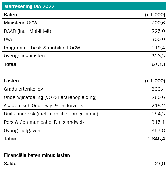 In 2022 ontving het DIA de bijdrage van het ministerie van OCW als een instellingssubsidie. De financiering is toegekend voor het in dit kalenderjaar (mede) realiseren van vijf door het DIA uit te voeren Activiteiten/Projecten: