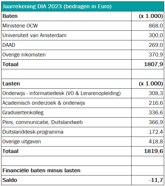 De stichting werkte in 2023 met uiteenlopende organisaties samen en ontving vergoedingen van onder meer de Faculteit der Geesteswetenschappen van de UvA (Amsterdam School of Historical Studies; in verband met een gematcht promotietraject), het Goethe-Institut Niederlande vanwege de organisatie van gemeenschappelijke publieksprogramma’s en NWO voor het project ‘Blik op de Muur 2.0’. Ook ontving het DIA middelen vanuit het Horizon-programma (Europese Unie) en werden in 2023 de bijdragen ingezet van vijf Euregio’s aan de Duits-Nederlandse grens voor het project Mach mit! Mobil in het schooljaar 2022/2023.
