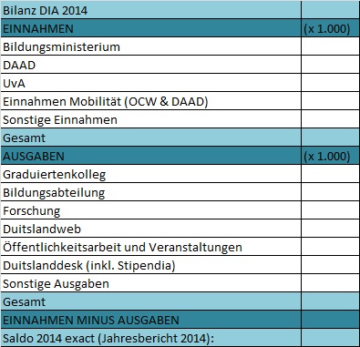 Seit 2013 finanziert das niederländische Bildungsministerium den Duitslanddesk und das Mobilitätsprogramm des DIA, worunter auch das DIA-Stipendium fällt. Dieses Stipendium wird gematcht vom DAAD. Der DAAD hat außerdem für das Mobilitätsprogramm einen Lektor angestellt. Desweiteren erhält das DIA regelmäßig Projektgelder.