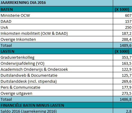 Sinds 2013 financiert het ministerie van OCW de Duitslanddesk en het mobiliteitsprogramma van het DIA, waaronder het DIA-Stipendium valt. Dit stipendium wordt gematched door de DAAD. Ook heeft de DAAD ten behoeve van het mobiliteitsprogramma een lector ingesteld. Verder ontvangt het DIA regelmatig projectsubsidies.