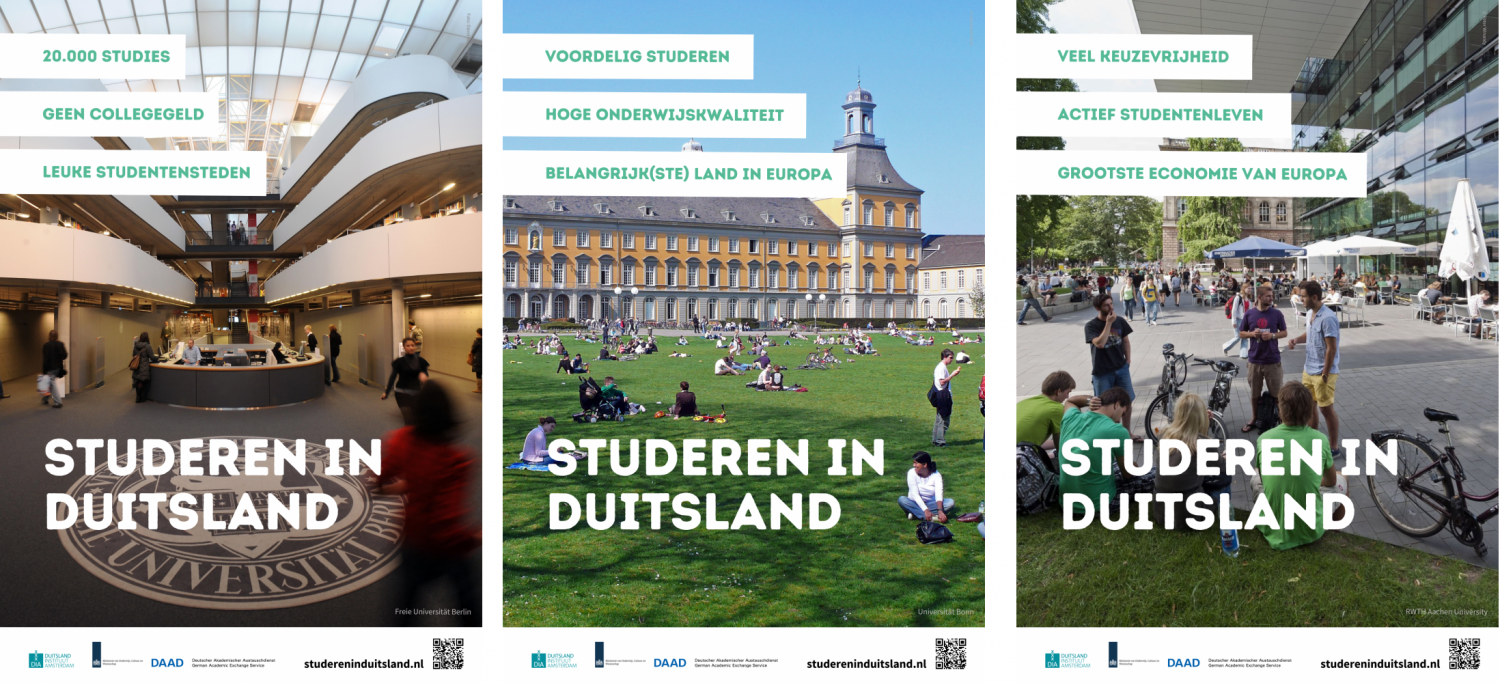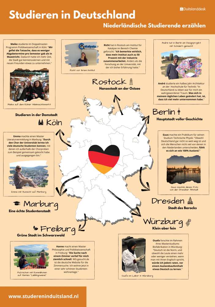 Nederlandse studenten vertellen over hun ervaringen in Dresden, Würzburg, Marburg, Keulen, Freiburg, Rostock en Berlijn. Deze poster is compleet in het Duits.